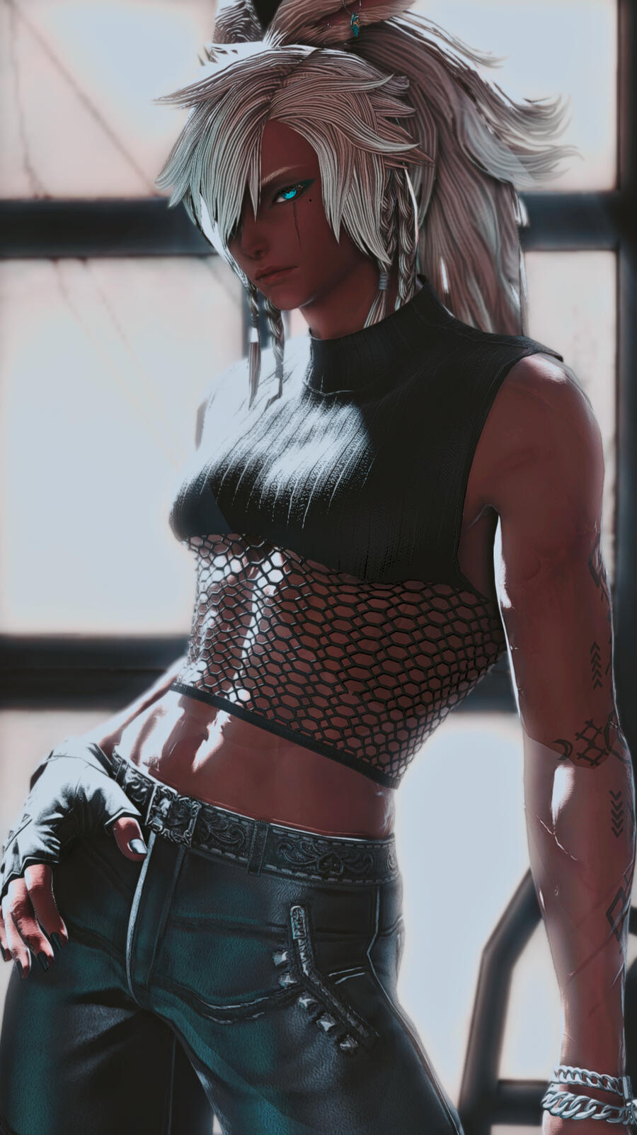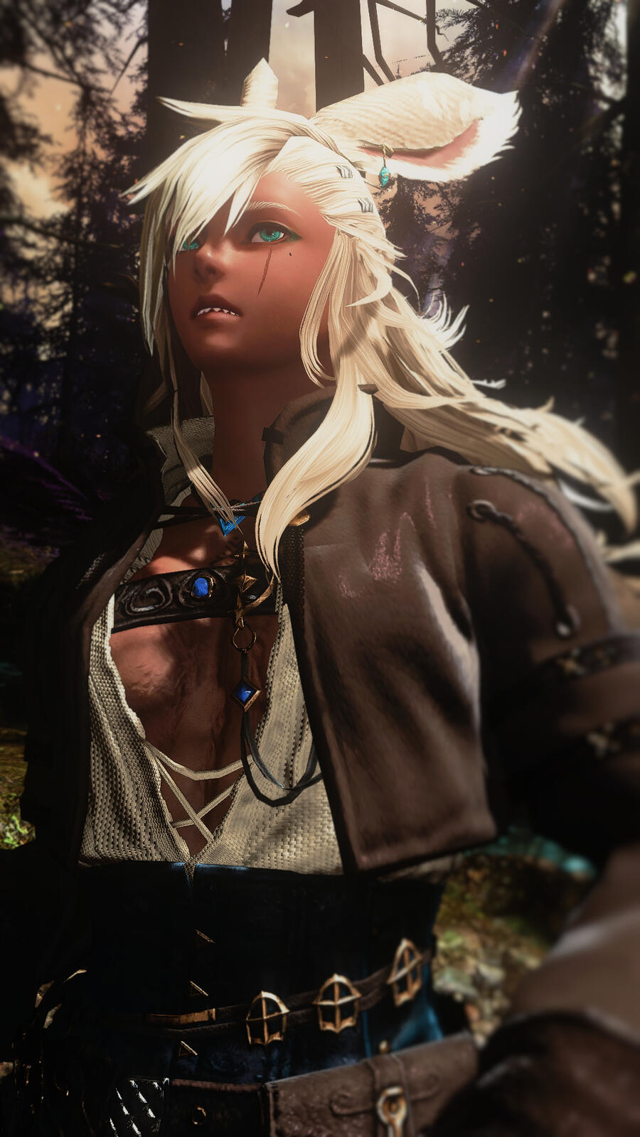 Notable Features. A scar under his left eye. Teal tatted lining around his eyes. Speckled spotted ears. A fluffy bunny tail. Beast like fangs and teeth. Scarred body with tribal marks